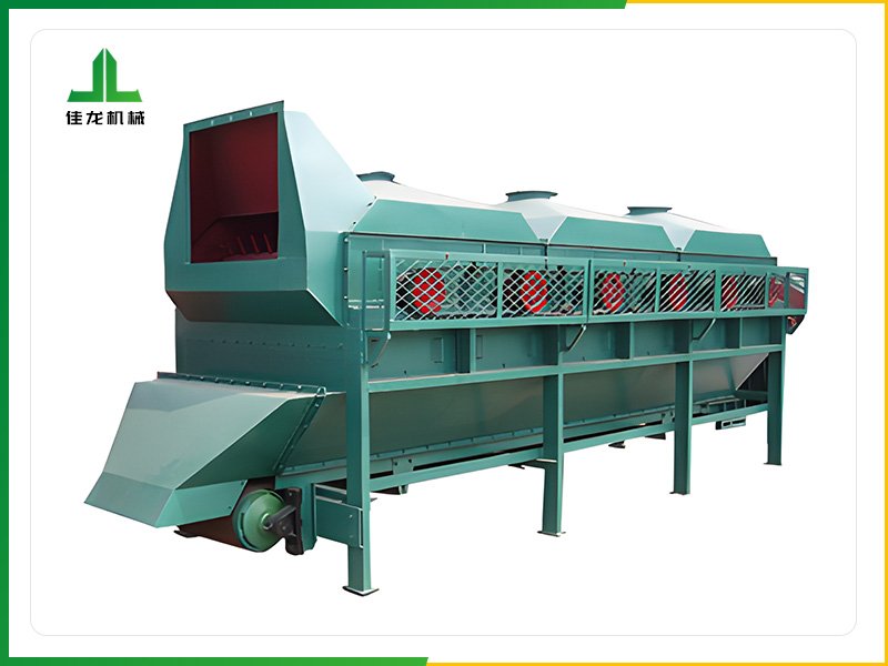 輥式除塵機又稱羊角篩,它往往多台串聯使用。其轉鼓上固定有錐形短棒。轉動時把弧形篩板上的草片打散翻動,並使(shǐ)重物如(rú)沙塵、穀料等(děng)通過篩(shāi)板落下。
